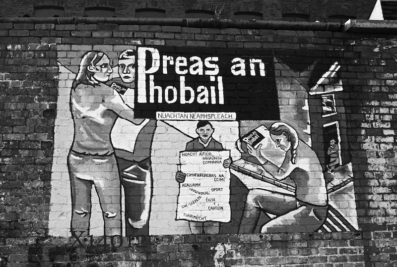 ‘Preas An Phobaıl’ was an Irish-Language weekly in Belfast, published between 1981-1984. (It became the daily ‘Lá’ in 1984 – RTÉ News video – which was published until 2008 – NVTv video.) The mural was at Townsend St/Divis St.