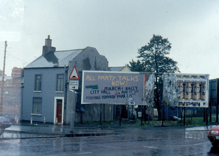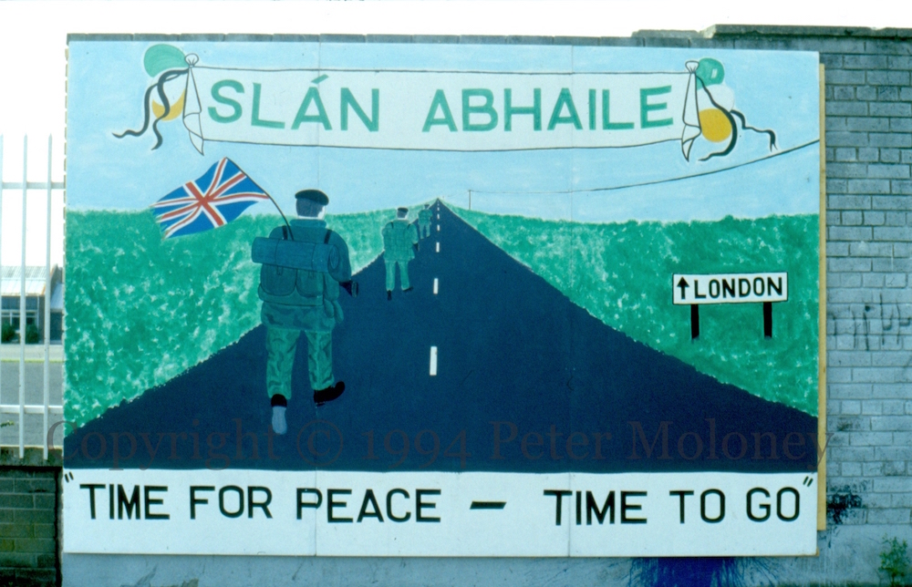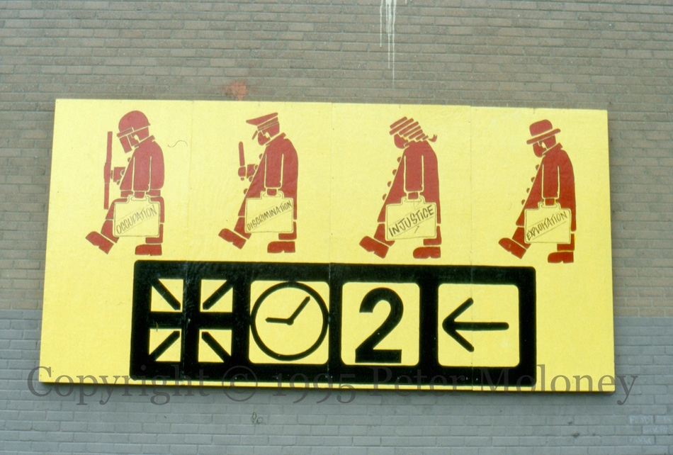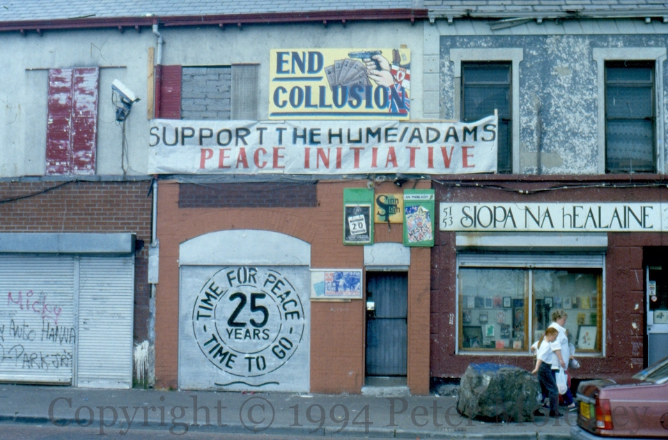 The prospect of peace talks immediately suggested to many republicans the removal of British troops (though not a united Ireland). This circular design “25 years – Time for peace, time to go” was prominent. This example is on the Sınn Féın office on the Falls Road, Belfast.