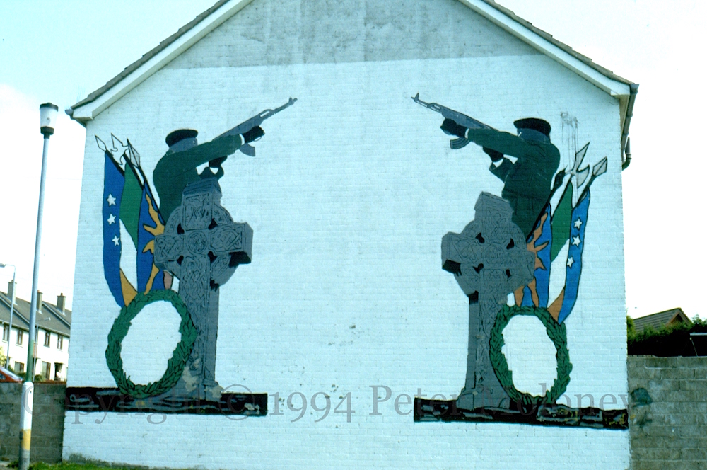 Murals about republican issues consumed much of the energy in republican muraling and as the IRA was on ceasefire, murals showing IRA weapons and volunteers in action were no longer painted. This mural in the Shantallow area of Derry is incomplete, though it is not known exactly why. The image is of a funeral volley rather than of paramilitary activity but might have nonetheless be deemed overly militaristic.