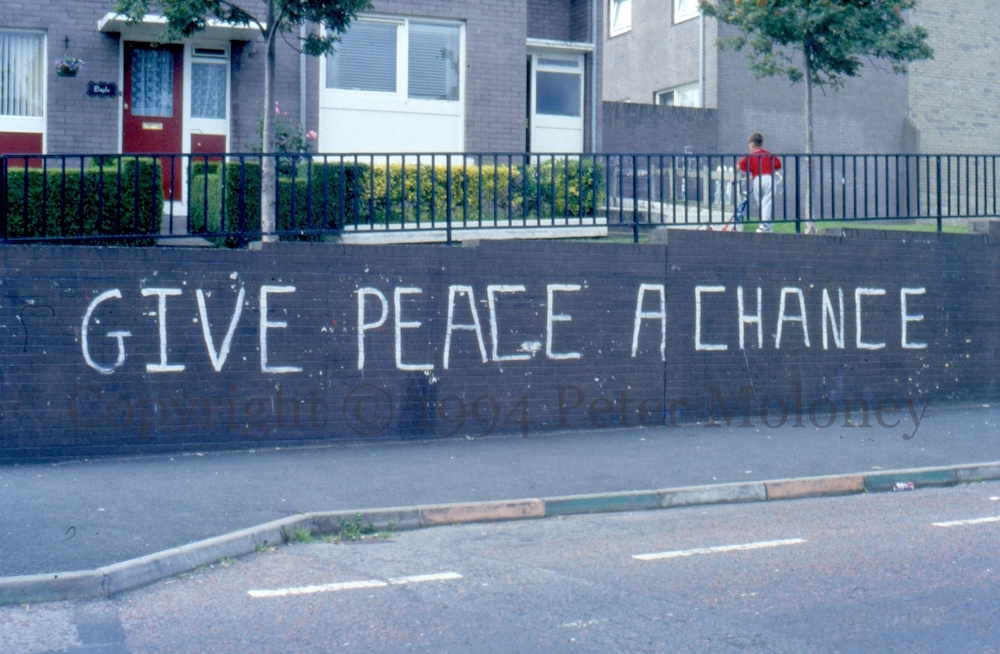 The phrase “give peace a chance” was popularised in a 1969 anti-Vietnam War song by John Lennon/Plastic Ono band (youtube). Bishop Street, Derry.