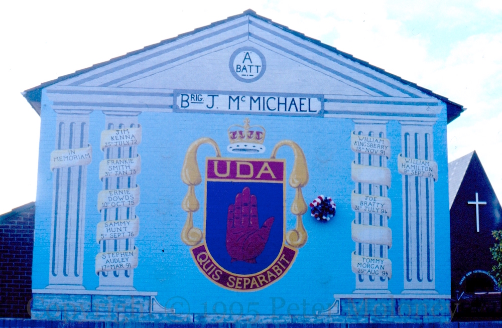 This image of a 3-in-1 RUC officer, Orange Order member, and loyalist paramilitary has been used into the era of the PSNI. Lecky Road, Derry.