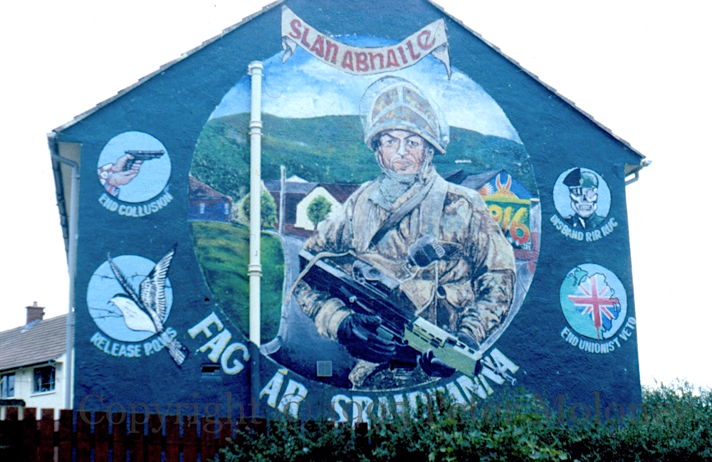 “Fag ár sraıdeanna” (“Leave our streets”) painted on, and depicting, the Whiterock Road, Belfast. They are clearly “our” (i.e. CNR) streets because of the Easter Rising mural (1991 M01002) behind the soldier’s left shoulder. The four small circles in this modified version of Slán Abhaıle list four additional nationalist demands: end collusion, release POWs, disband RIR/RUC, end unionist veto.