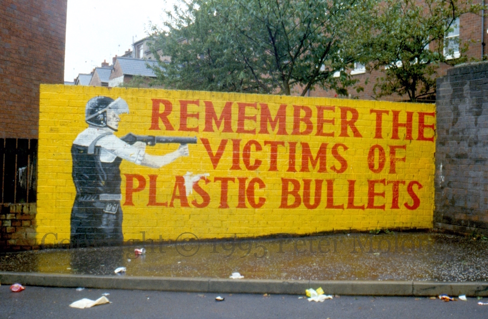 Justice for those killed by (rubber and) plastic bullets began to come to prominence. This issue would be receive more attention after the Good Friday Agreement. Examples include the Nora McCabe board that persists to the present day (2001 M01445) and ‘Ban Plastic Bullets’, a life-sized mural on what became the International Wall on Divis Street, of the distances at which victims were hit (2001 M01504). The following image is from the (CNR) New Lodge.