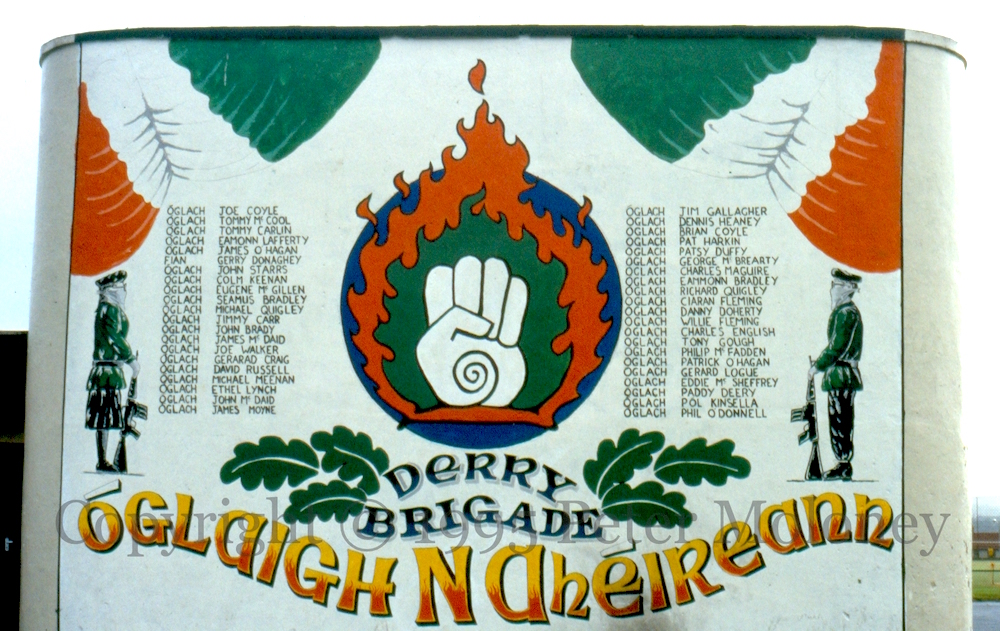 This one was painted on the back of Free Derry Corner. Others were painted in the Short Strand area of east Belfast (M01691), in Letterkenny, Co. Donegal, Ireland (M01297; see also M01299), and above the Sınn Féın offices in Belfast (M01236).