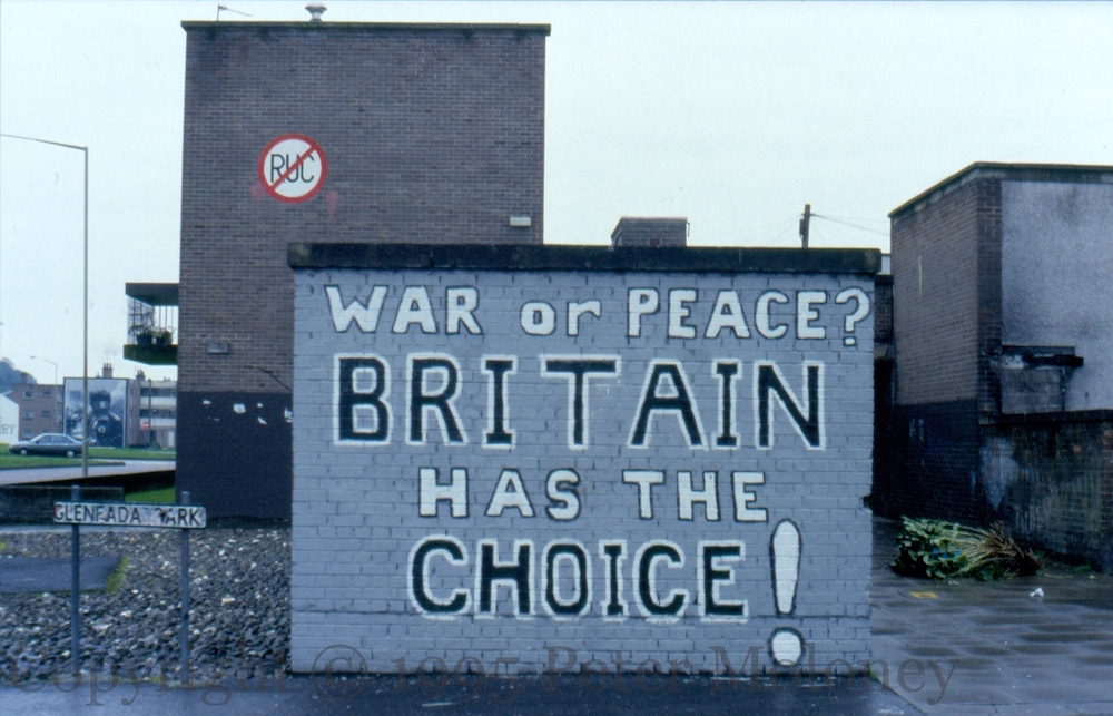 “Peace or war?” Commentary on the peace process on Derry’s bogside wall: “Peace or war?”, with an insistence on talks before decommissioning: “[Not a bullet,] Not an ounce.”