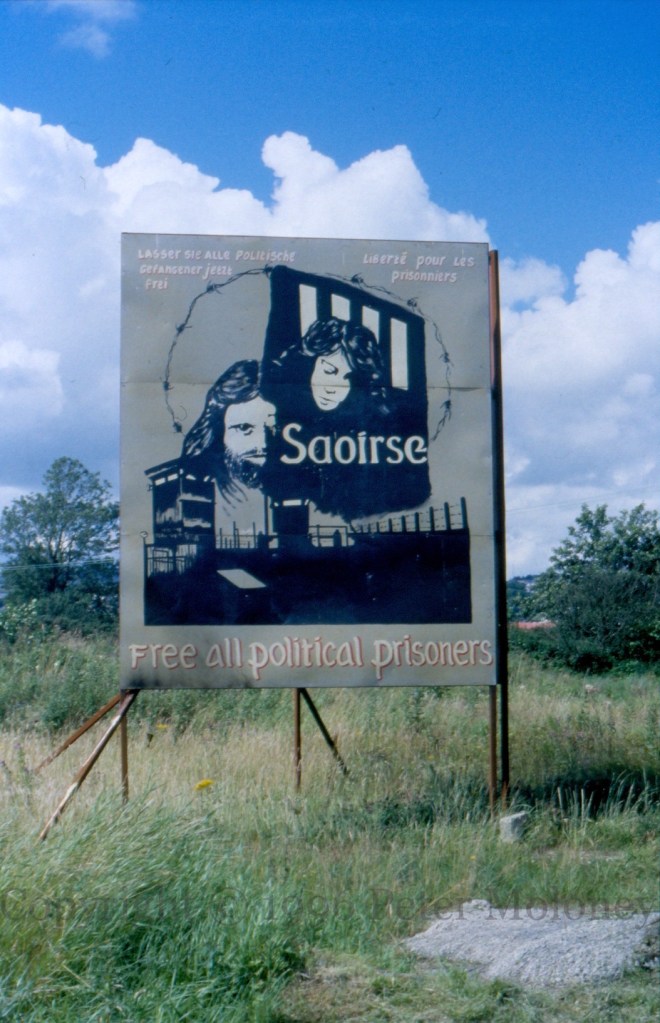Freedom (“saoirse”) for all political prisoners in English (“Free all political prisoners”), German (“Lasser sie alle politische gefangener jetzt frei”), and French (“Liberté pour les prisonniers”), aimed at tourists in Letterkenny, Ireland.
