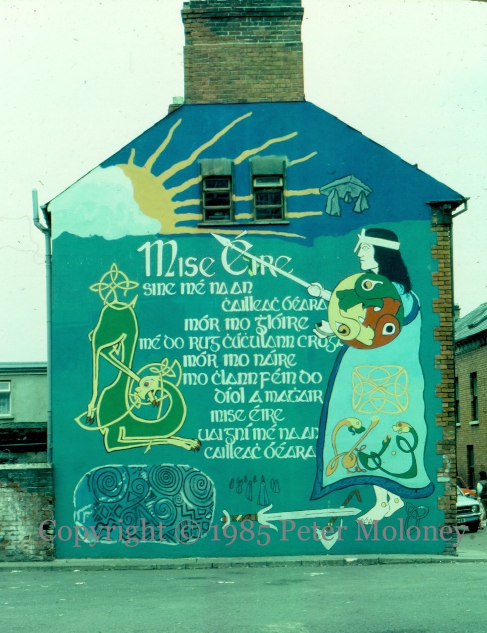 Pearse’s poem Mıse Éıre has Ireland speak in the person of an aged (and perhaps eternal) woman. The earliest appearance of the poem in a mural appears to be this 1995 piece in Derry’s Bogside. Several lines are included alongside imagery from Celtic Ireland.
